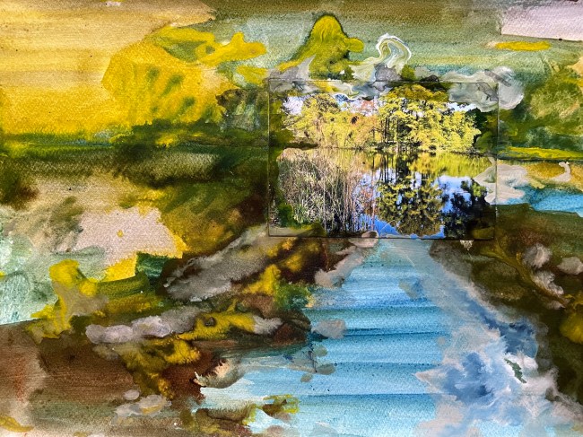 De collagetechniek die ik hanteer in mijn schilderen heeft verschillende voordelen. Ten eerste levert een afbeelding van een landschap die ik midden op een leeg vel papier plak een aanknopingspunt en tevens uitgangspunt voor een te schilderen landschap. De foto van een bestaand landschap geeft een richting aan, prikkelt mijn fantasie en geeft tevens een kader om de relatie tussen hemel en aarde, boven en beneden vorm te geven. Een berglandschap levert een ander schilderij op dan een foto van een meer, een moeras of een weg. Ook de wolkenpartijen spelen daarin een rol en de weerspiegeling van de hemel in het water van een meer of rivier. In feite leveren de bestaande foto’s van een landschap het motief voor het schilderij. Hoe deze foto dan uiteindelijk deel gaat uitmaken van een groter (en gefantaseerd) geheel is mede afhankelijk van het moment en de keren dat het werk wordt opgepakt en aangepast, net zo lang tot ik tevreden ben. Ik ben tevreden als er verschillende lagen door het werk heen schemeren, als het niet helemaal is dicht gekalkt waardoor er geen enkele vorm van diepte meer aanwezig is. Dat betekent dus op tijd stoppen met schilderen.