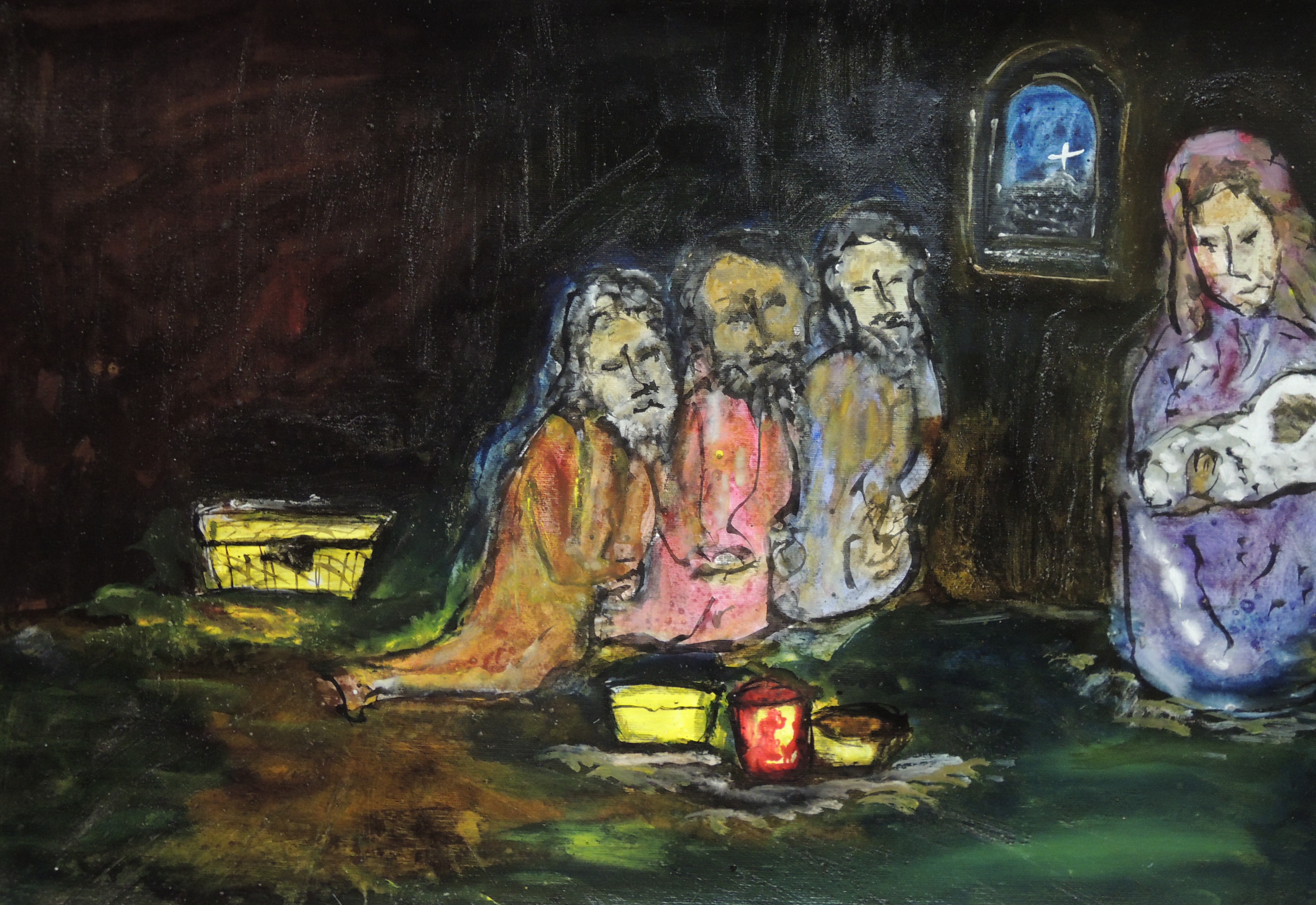 Een half jaar geleden heb ik een aantal schilderijen gemaakt waarin het leven van Maria centraal staat en de opdracht die ik mezelf daarbij heb gegeven luidt: probeer je voor te stellen wat Maria heeft beleefd, wat zij zag. Probeer dat te verbeelden, in te vullen, uit te werken in het schilderij. Ik heb 2 afbeeldingen meegebracht van het bezoek van de magiërs aan het kind. Eentje laat de gebeurtenis zien, de ander kijkt vanuit Maria. Eigelijk klopt dit beeld al niet helemaal want we weten niet hoeveel magiërs het betreft. Daar kwam ik pas achter tijdens het schrijven van deze overweging. Zo zie je maar weer hoe je kijken, je perspectief, is gekleurd door vanzelfsprekende gewoontes en gebruiken. Onze bijbelvertaling is er ook een goed voorbeeld van.