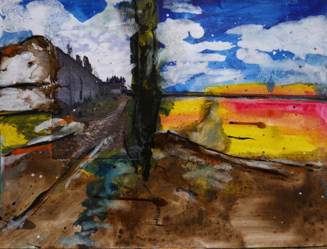 Een oude boerderij (Gieveld) in verval die ik al jaren fotografeer vormt de aanleiding en het startpunt voor een serie landschappen (collages) waarbij de foto uitgangspunt is. Ik heb twee series geschilderd met verschillende afmetingen, met pigment, sumi-e en inkt.