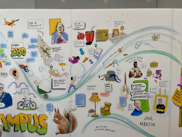 Op 1 november werd op de campus van de Radboud Universiteit een dag georganiseerd rond het thema welzijn, duurzaamheid en gezondheid van studenten en medewerkers. 1 November is in de katholieke traditie ook het feest van Allerheiligen. Heiligen zijn de illustere voorgangers die tot navolging uitnodigen. Maar het woordje heilig betekent letterlijk in het Hebreeuws ‘apart gezet’. Dus niet het stralenkransje, ook een vorm van onderscheiding, maar even iets totaal anders doen dan wat je gewoon bent te doen. Daarom is de Sabbat heilig omdat deze onderscheiden is van de andere zes (werk)dagen. Op die dag werk je niet, maar wijd je jezelf aan de studie van de Tora bijvoorbeeld. Of onderzoek je in hoeverre je leven en je werk nog in overeenstemming zijn met je roeping, je idealen, je gelovig zelf verstaan. Op deze eerste november hadden zo’n 30-35 mensen hun werk even opzij gezet om zich te wijden aan een droom. De droom hoe de campus eruit zou zien in 2030 en welke bouwstenen daarvoor nodig zouden zijn. Twee illustratoren maakten een beeldverslag van dit proces waarin zij het gehoorde en beleefde vastlegden in mooie tekeningen en teksten die de sprekers en deelnemers naar voren brachten.