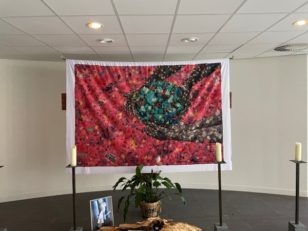 Dat is het thema van het Hongerdoek 2023 gemaakt door Emeka Udemba. Het is een collage van veel lagen uitgescheurde krantenknipsels. Nieuws, informatie, feiten en vervalsingen – laag voor laag scheurt en lijmt de kunstenaar deze fragmenten en componeert daaruit iets nieuws. Van een afstand schittert de aarde op de hongerdoek als een juweel in turkoois groen en blauw. In de warmrode omgeving strekken vier armen zich uit: door hun gestalte en kleur zijn het de armen van twee mensen van een ander geslacht en etnische afkomst.