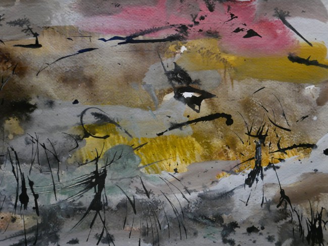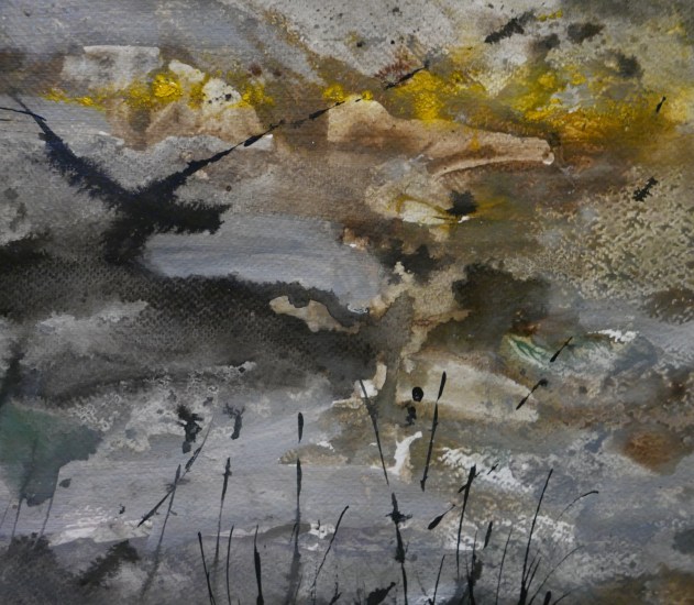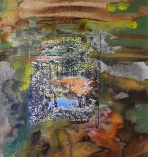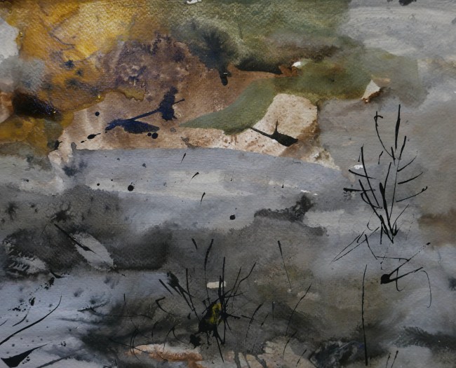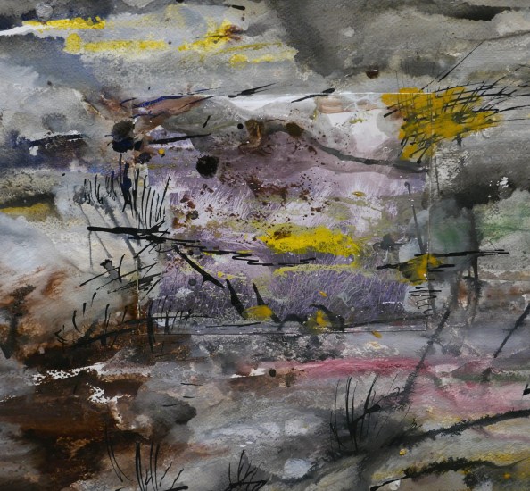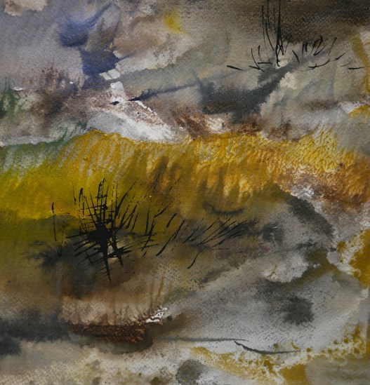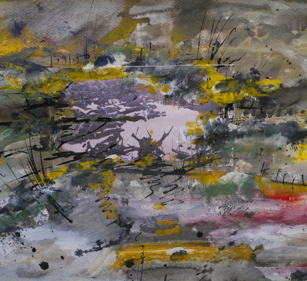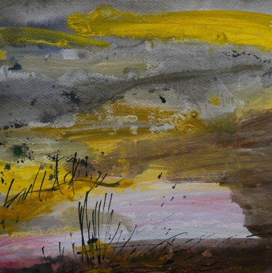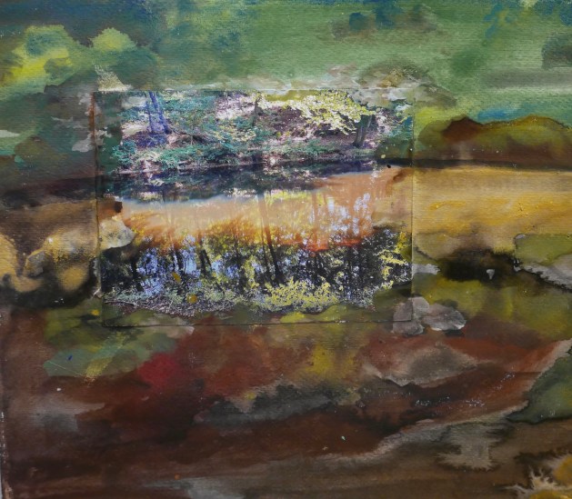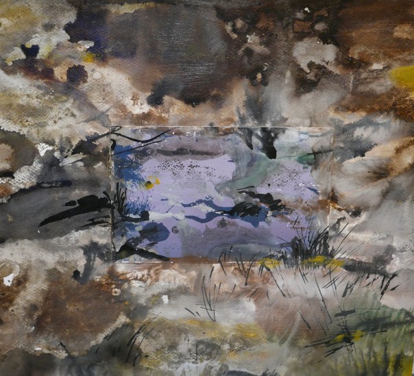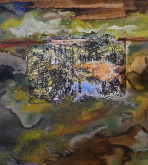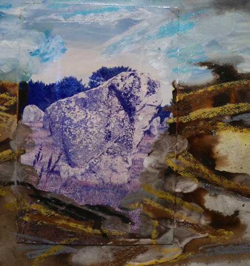 Landschap geschilderd met als uitgangspunt een foto: Karnak Bretagne (2), Jansberg Plasmolen (4) en Peel (foto uit een boek van Martien Coppens) (6) afmetingen wisselen rond 40×40 cm en kleiner. Allemaal te koop. Pigment, foto, inkt op papier.