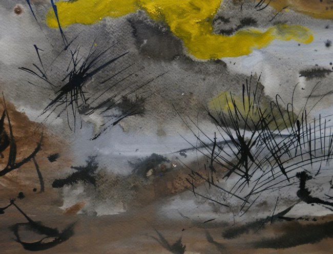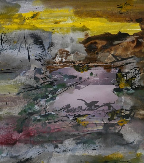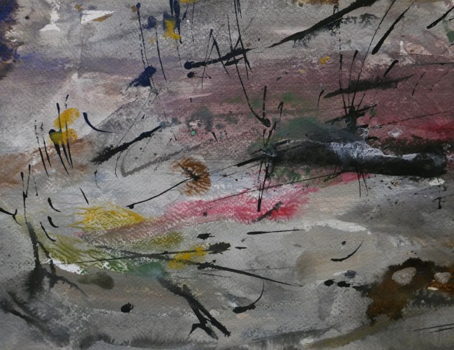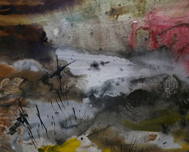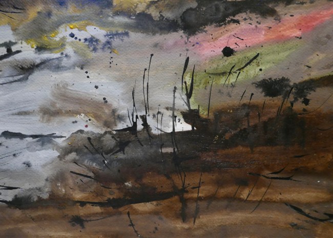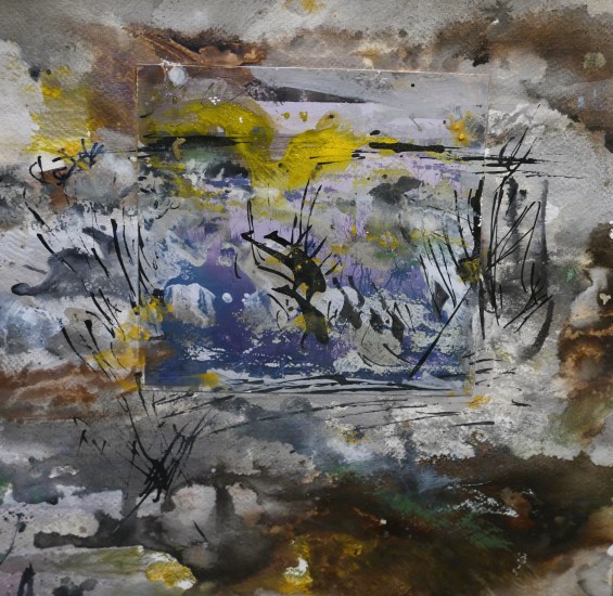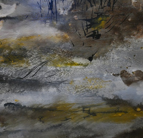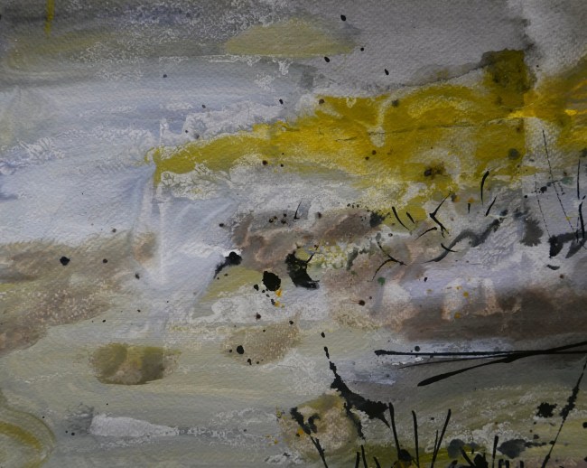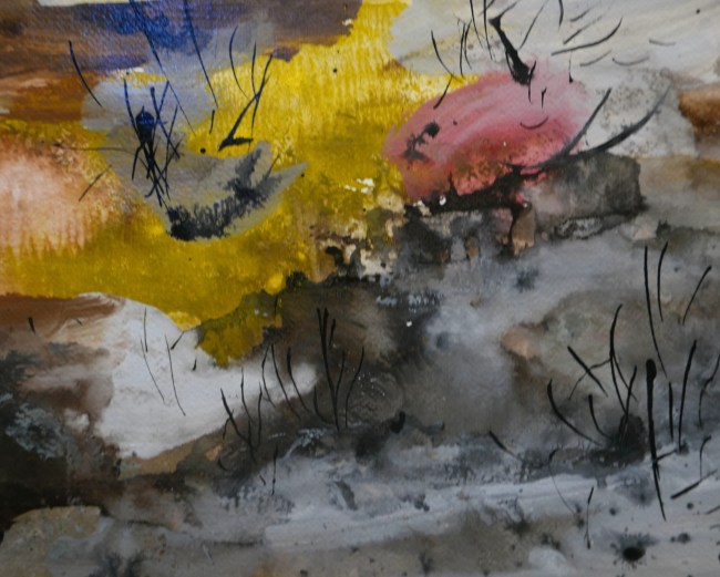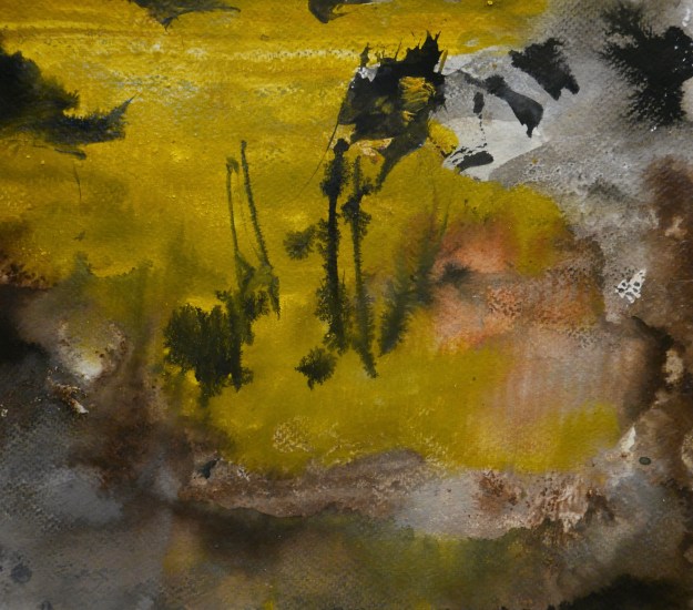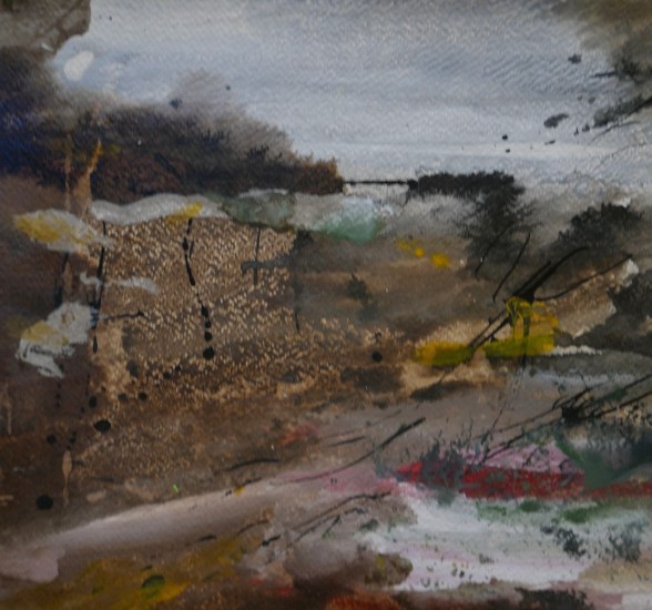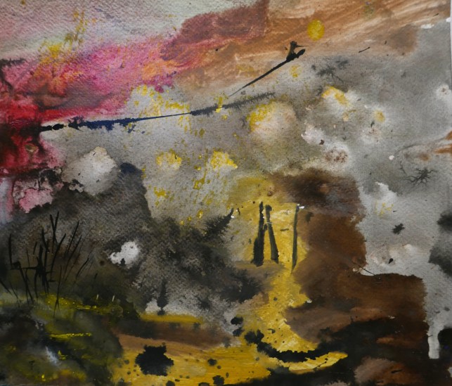Landschap geschilderd met als uitgangspunt een foto: Karnak Bretagne (2), Jansberg Plasmolen (4) en Peel (foto uit een boek van Martien Coppens) (6) afmetingen wisselen rond 40×40 cm en kleiner. Allemaal te koop. Pigment, foto, inkt op papier.