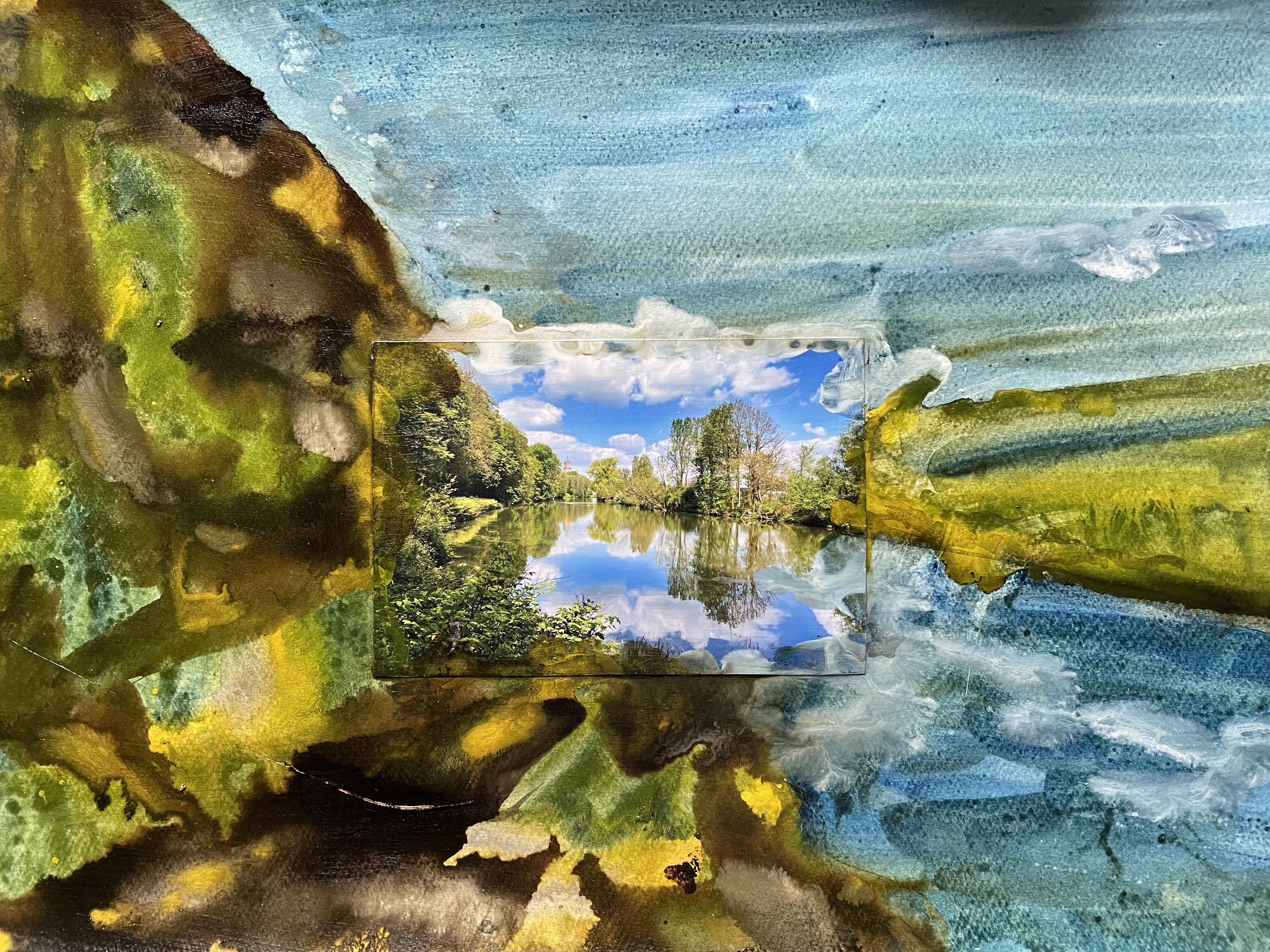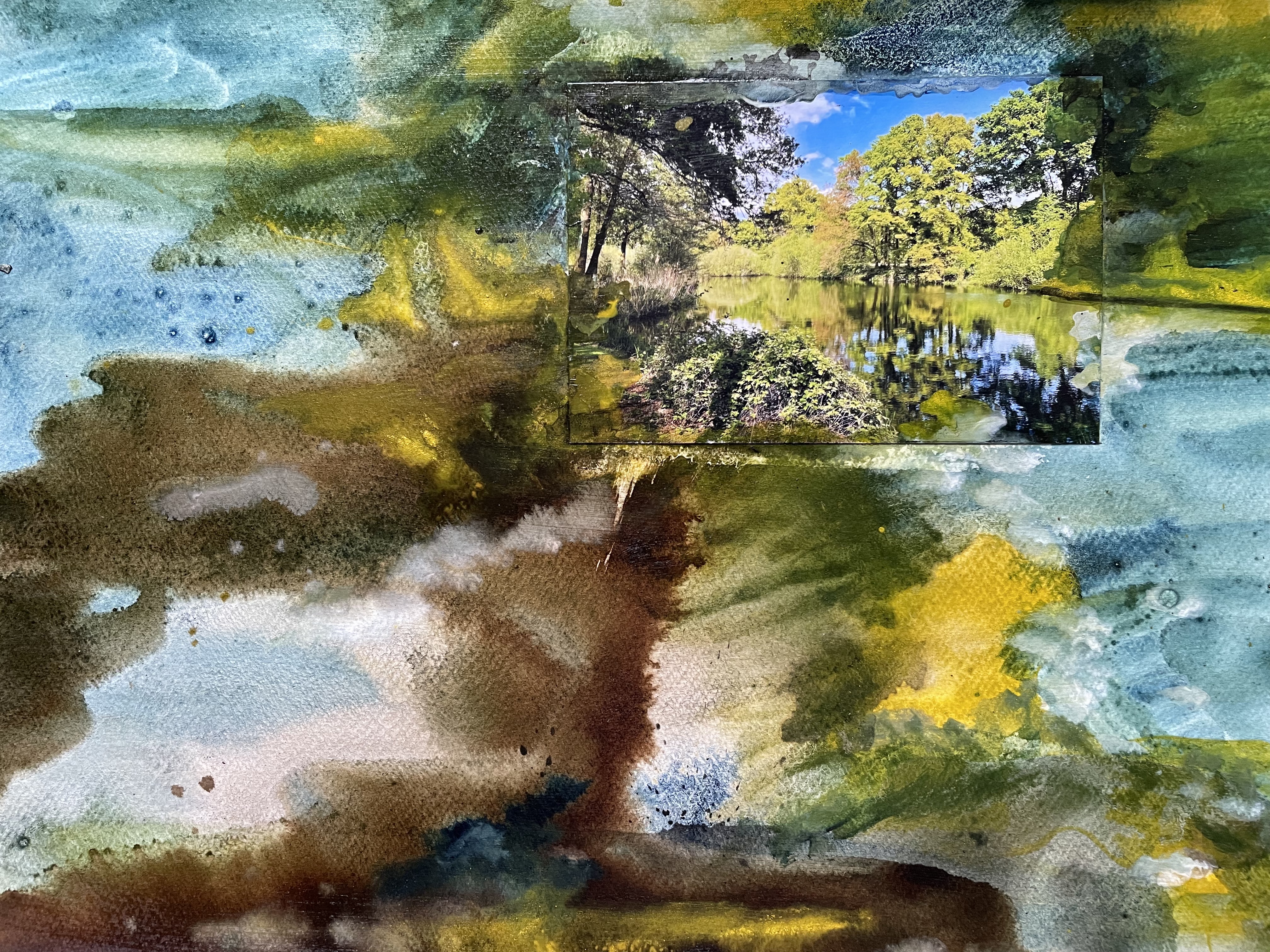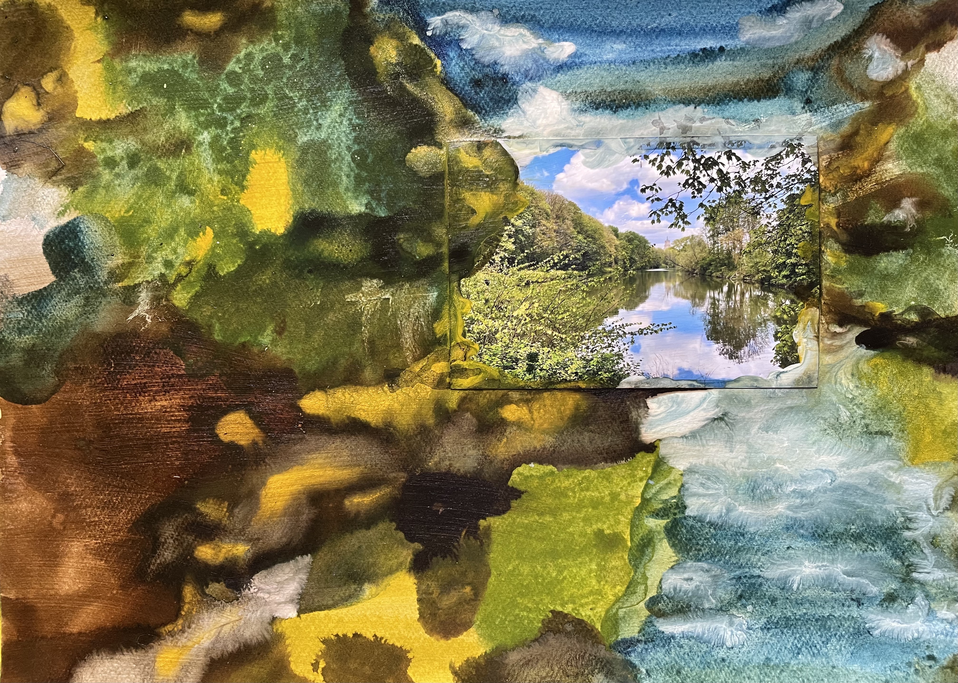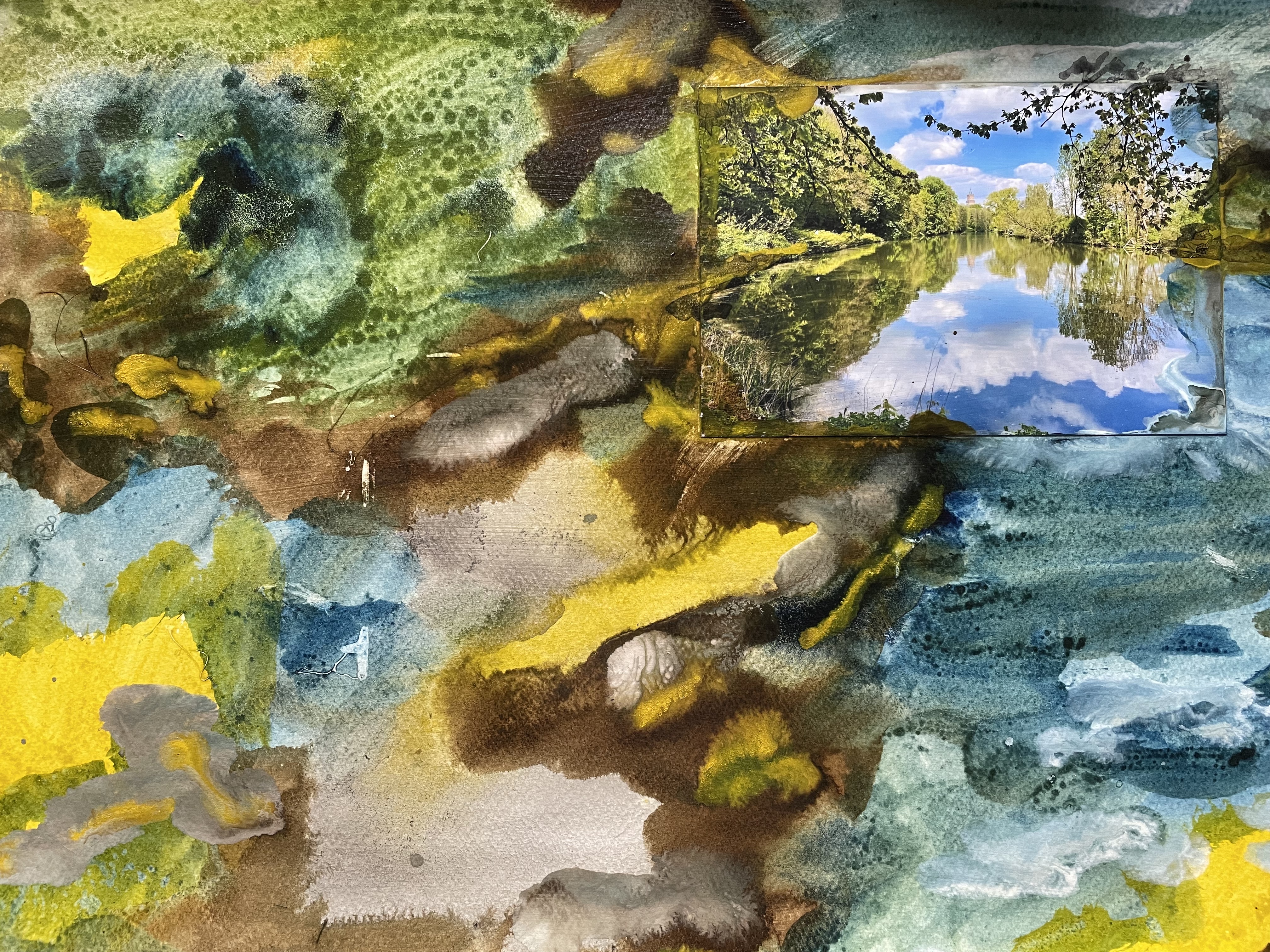 Foto’s van meertjes ontstaan door dijkdoorbraken en door een natuurlijk verloop, langs de dijk bij Heumen en Overasselt en bij Kleve Kermisdael, als uitgangspunt voor een abstract landschap. 2024 pigment op papier, foto, 30×40 cm allemaal te koop. Ook als kaart te bestellen. https://canandanann.exto.nl