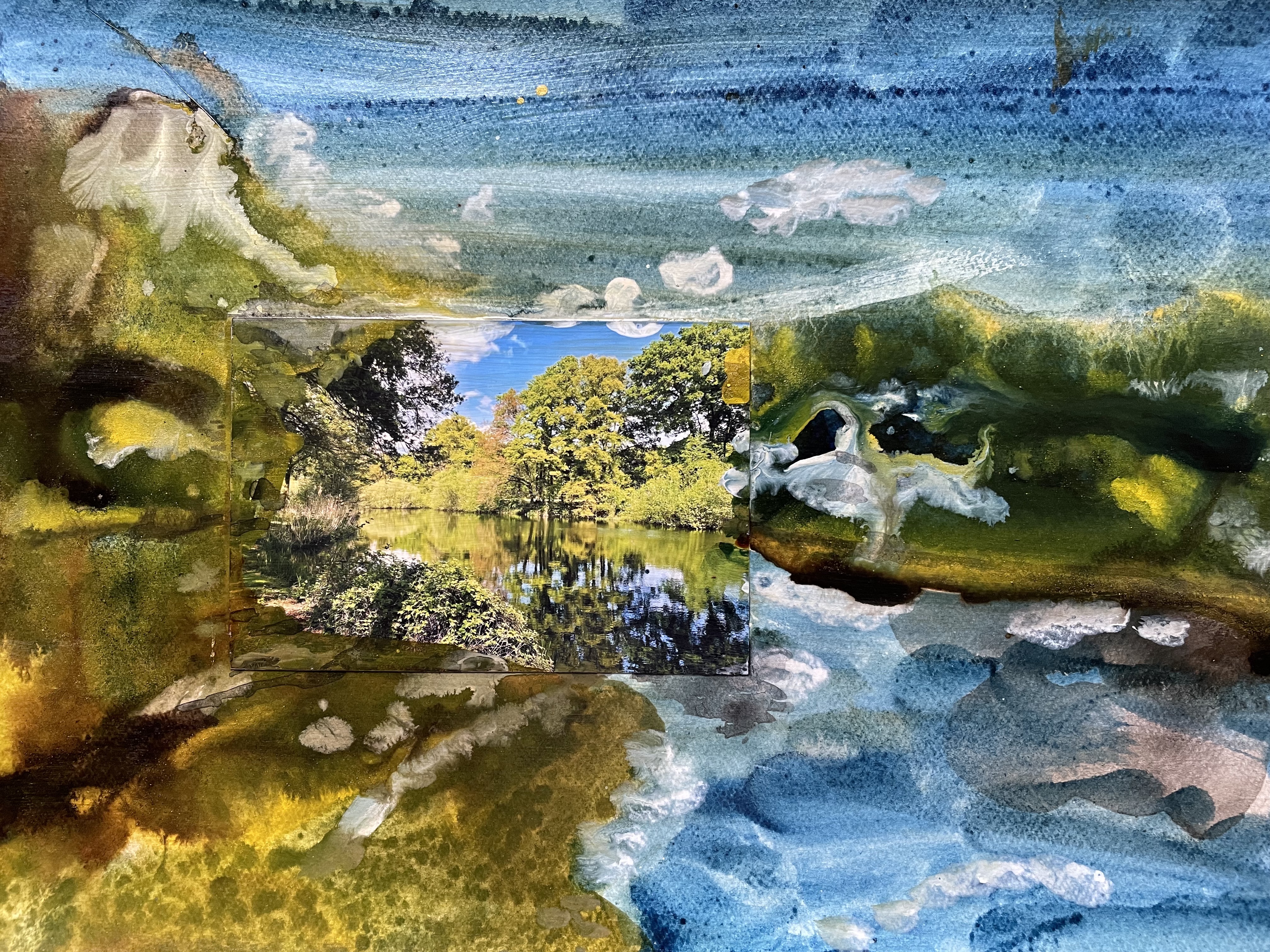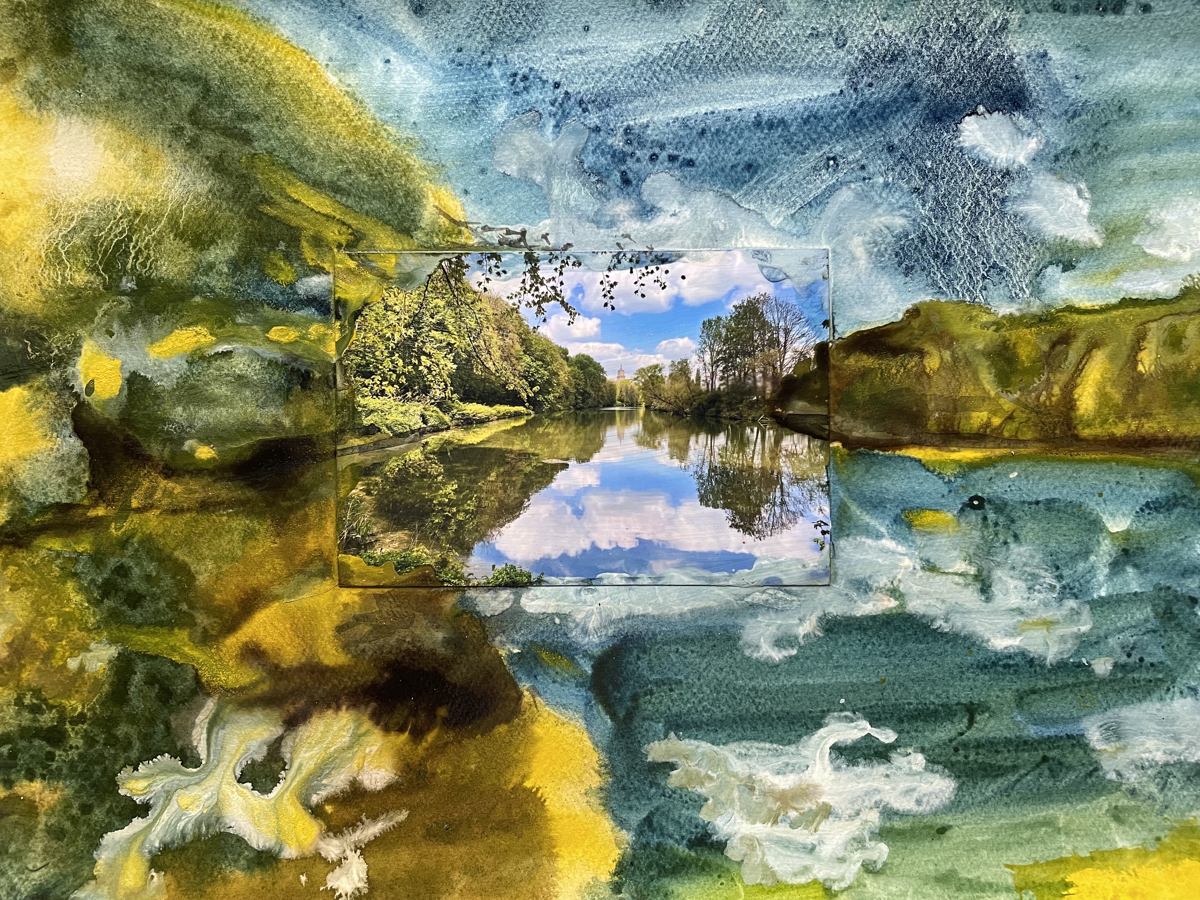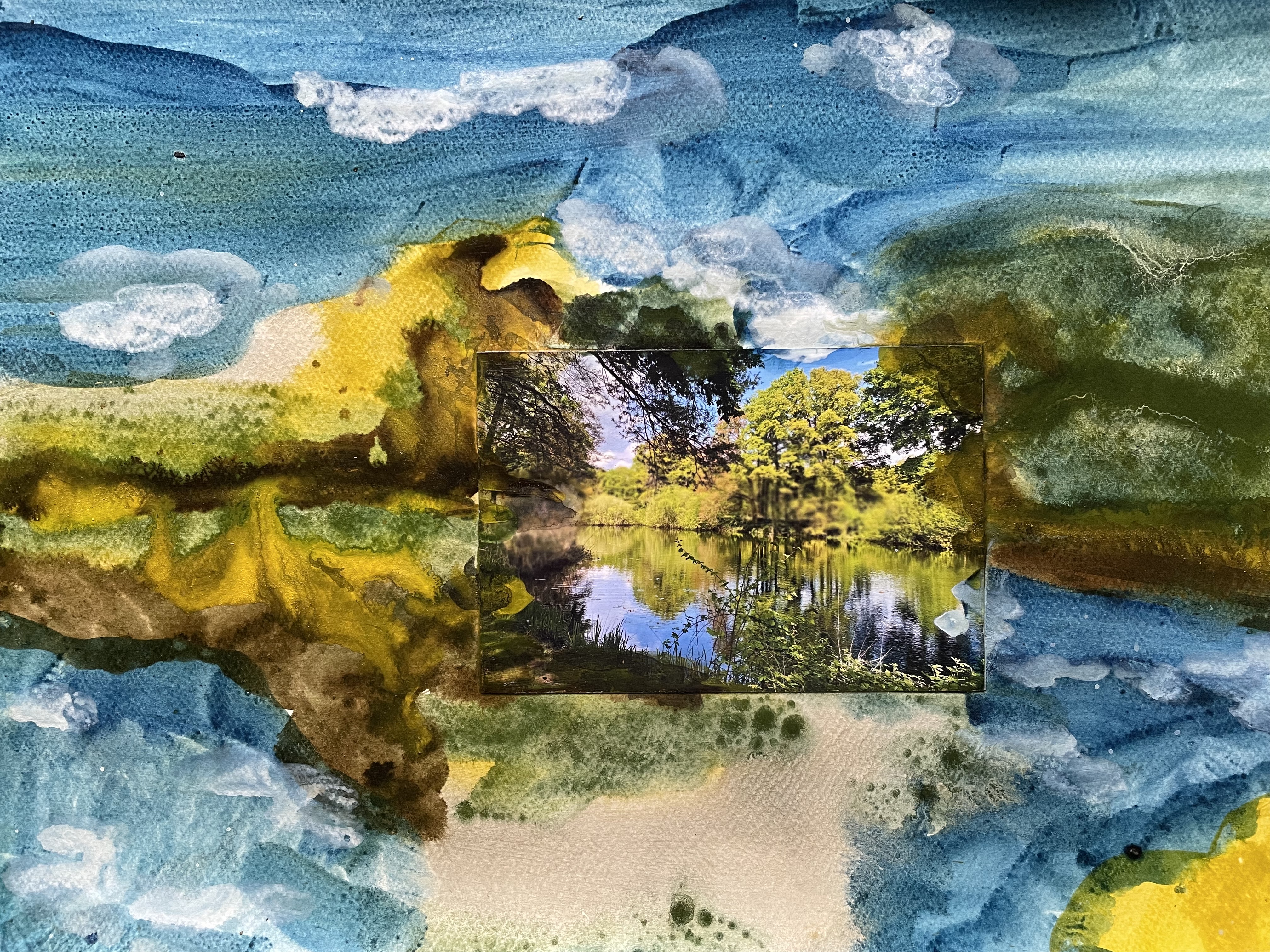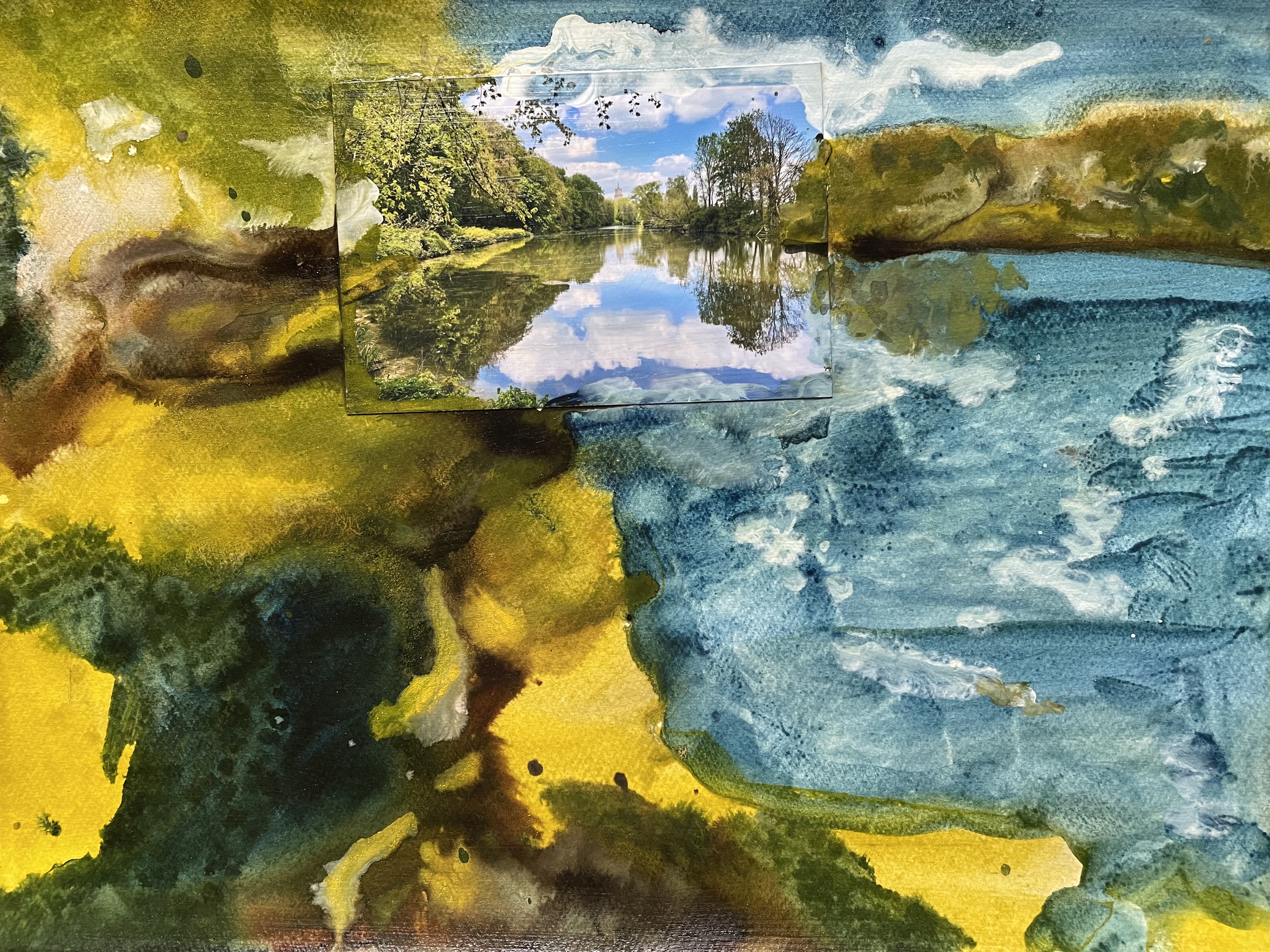 Foto’s van meertjes ontstaan door dijkdoorbraken en door een natuurlijk verloop, langs de dijk bij Heumen en Overasselt en bij Kleve Kermisdael, als uitgangspunt voor een abstract landschap. 2024 pigment op papier, foto, 30×40 cm allemaal te koop. Ook als kaart te bestellen. https://canandanann.exto.nl