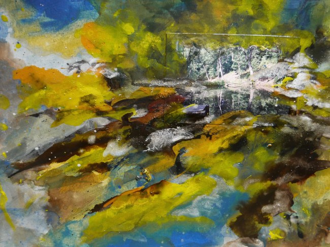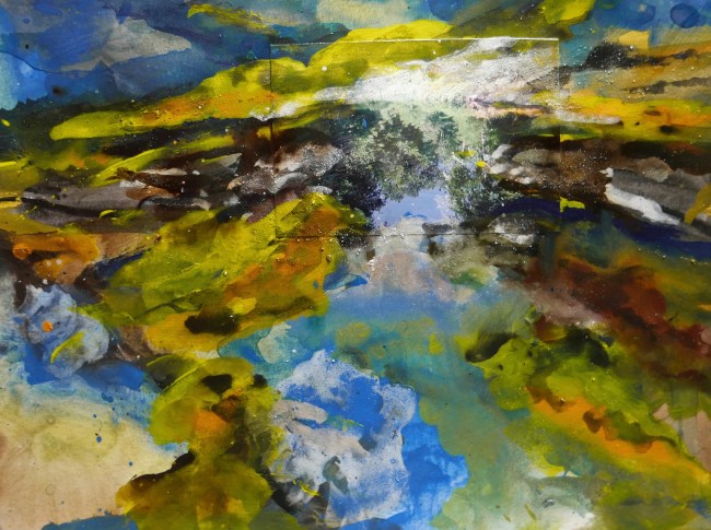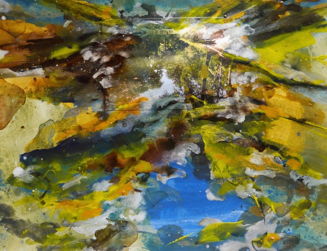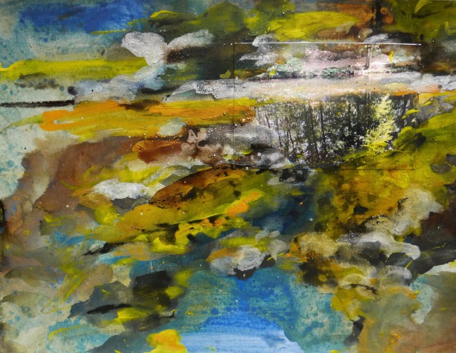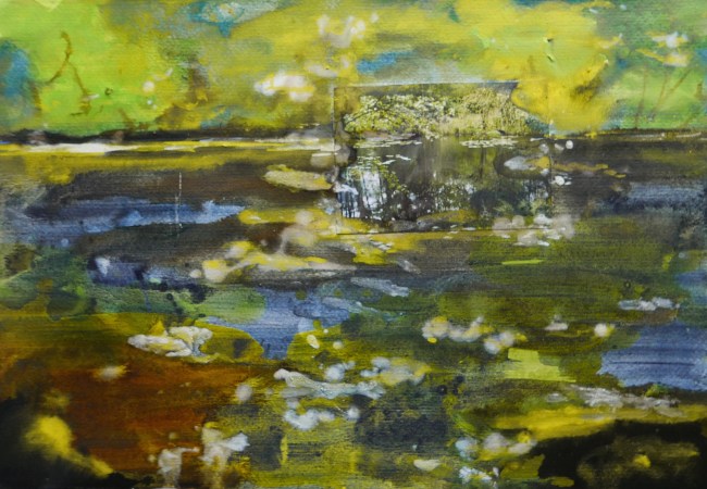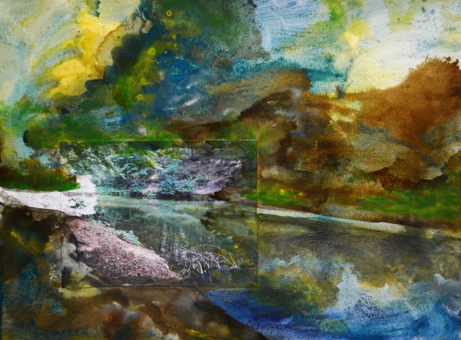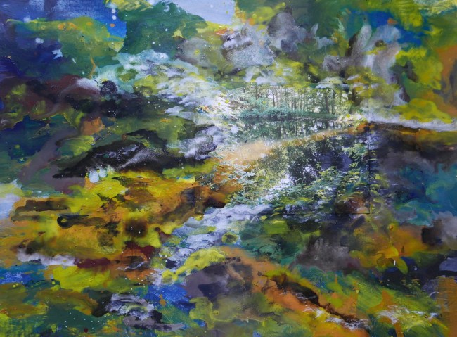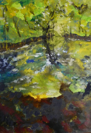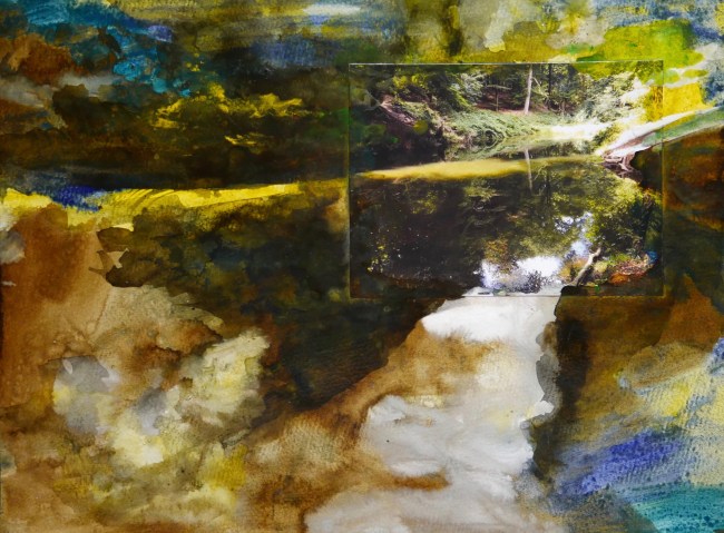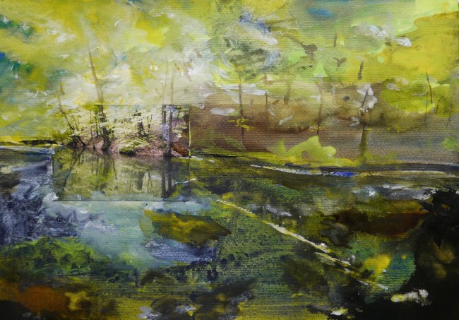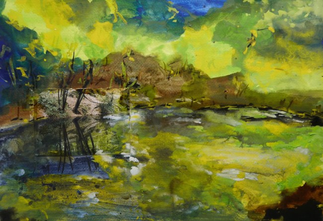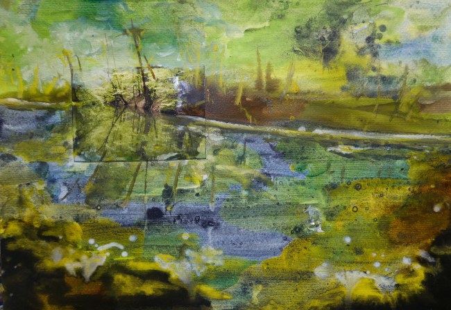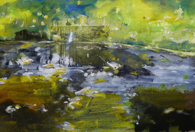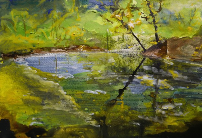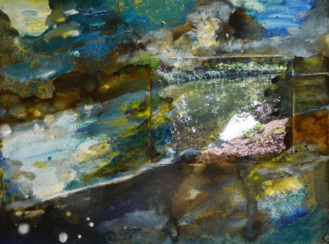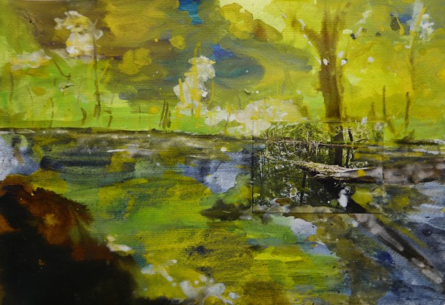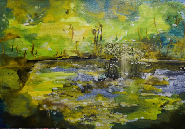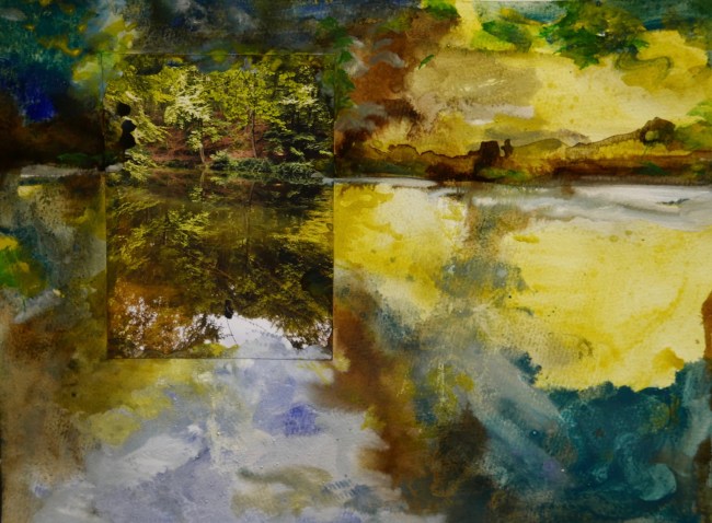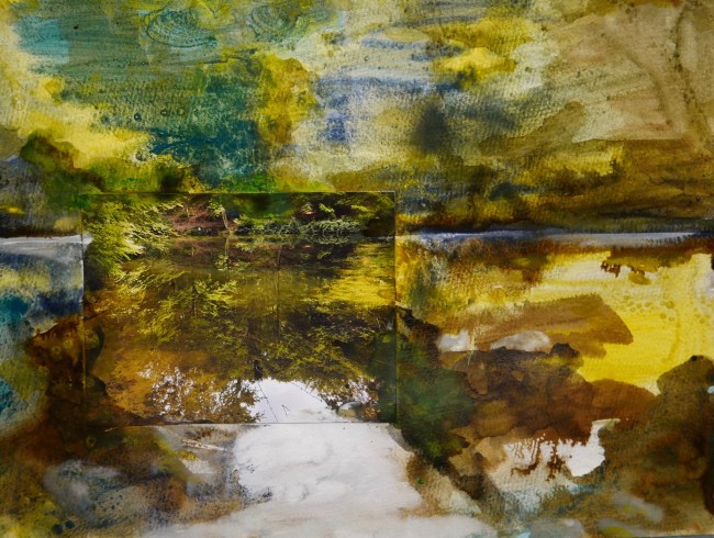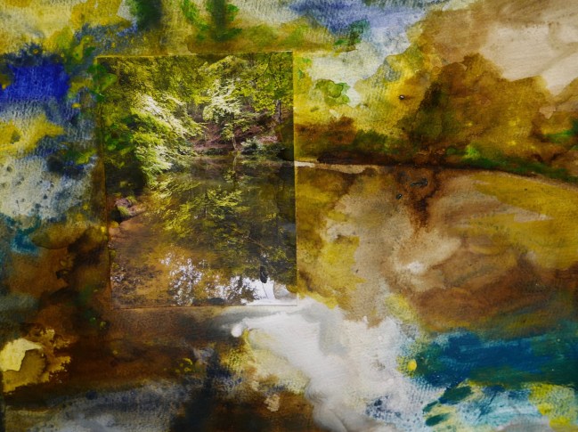 Plasmolen sint Jansberg – meertjes in het bos – aanleiding voor het maken van een aantal series met de foto als uitgangspunt. Pigment op papier, foto Jansberg.