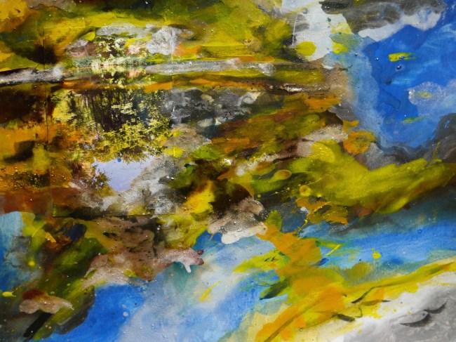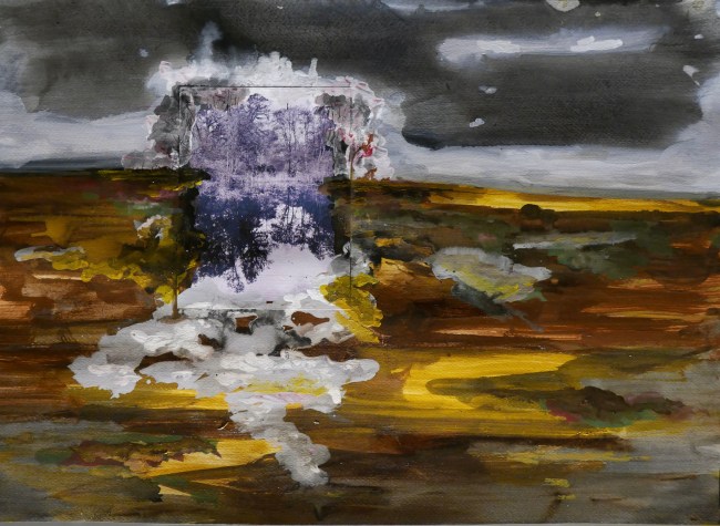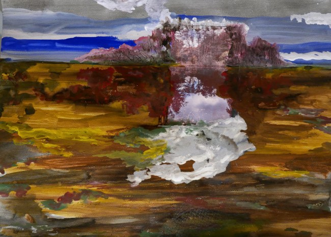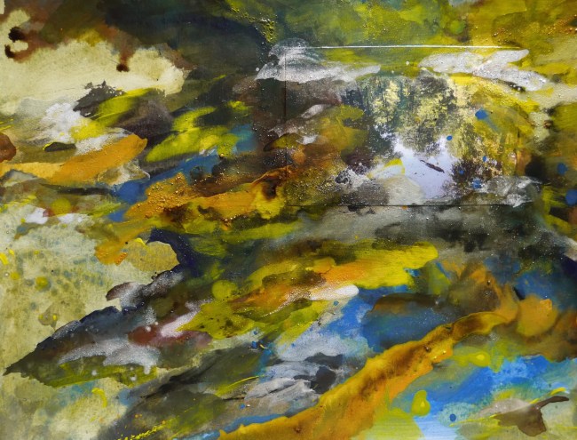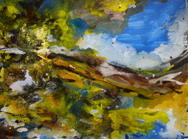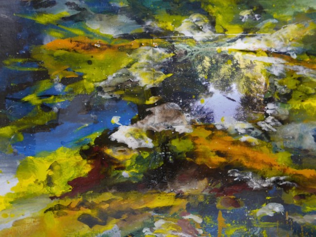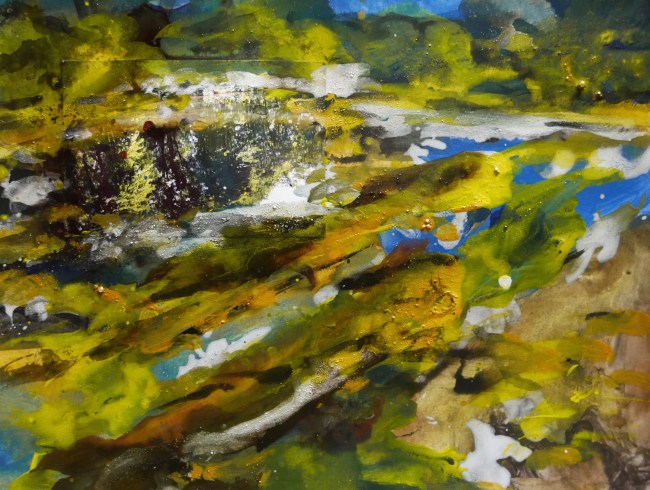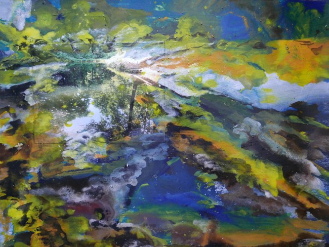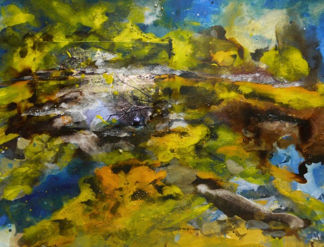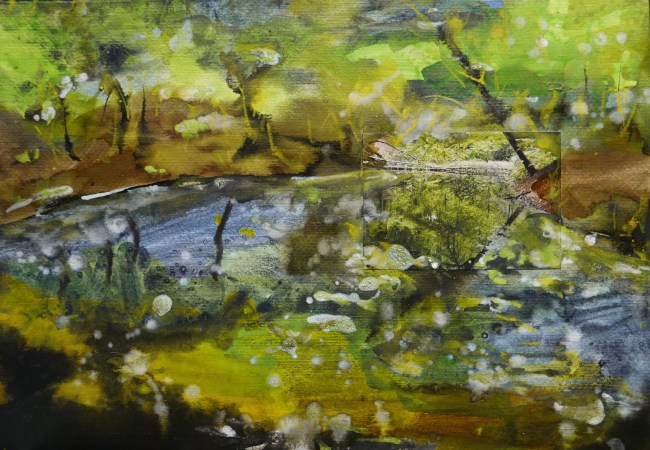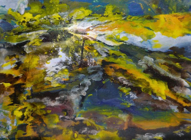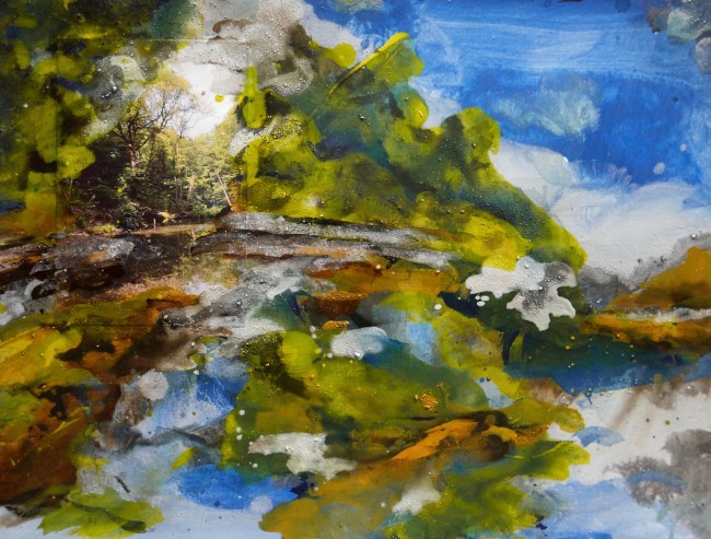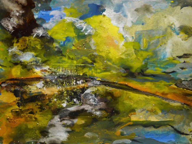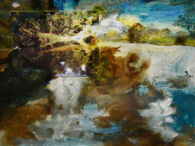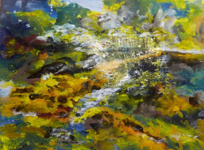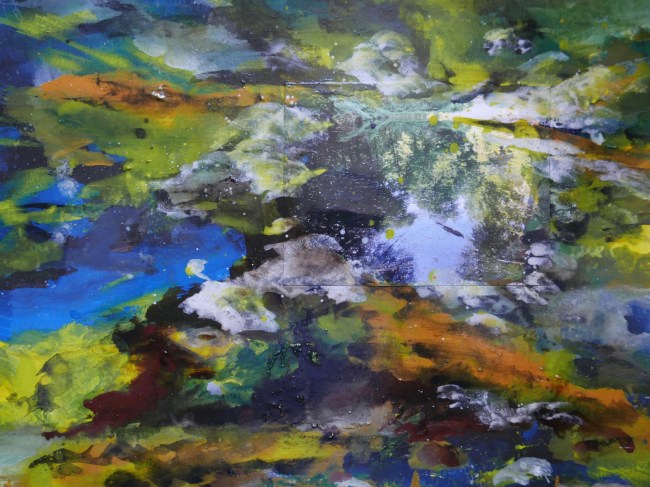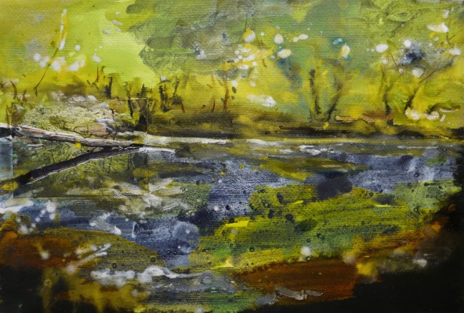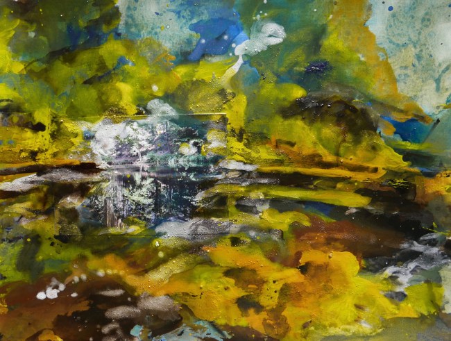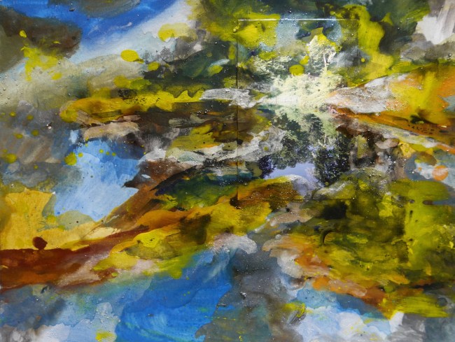 Plasmolen sint Jansberg – meertjes in het bos – aanleiding voor het maken van een aantal series met de foto als uitgangspunt. Pigment op papier, foto Jansberg.