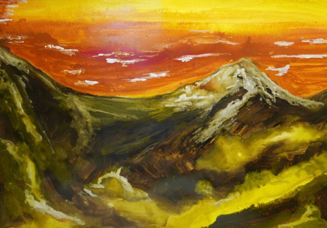 Often I use photo’s. Sometimes these photo’s are old (1920-1940) and they give witness of a landscape that has gone. A history that has passed. I use also photo’s I made by myself of interesting landscapes like rivers, moors and mountains. These photo’s figure as a starting point to paint a totally new landscape. My paintings express the process of giving meaning to the landscape and the special attention I give to the horizon. Literal and metaphorical spoken heaven and earth are meeting in this horizon. The horizon can therefore be a starting point to think about your life: where do I come from, where I’m going to, and so on. Painting is for me a search for meaning and the landscape can be metaphorically speaking a road to self-understanding. I like the unexpected possibilities in painting (with water-based paint). Poetry is an great inspiration for me.