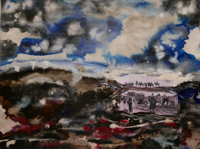 In de loop der jaren heb ik schilderijen gemaakt naar aanleiding van oorlogssituaties. Meestal vormt een afbeelding/foto het begin van een dergelijk (abstract) landschap. Soms zijn het oude foto’s (uit verzamelmapjes voor toeristen in de vorige eeuw, soms actuele foto’s die ik zelf maak van afbeeldingen in boeken of in documentaires op tv over oorlogssituaties in het verleden en heden.