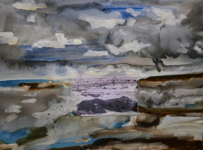 foto’s van het concentratiekamp Natzwiller Strutthof in de Buurt van Strassburg met nadruk op het landschap vanuit het kamp; 60×42 cm pigment, sumi-e op papier