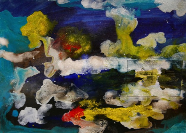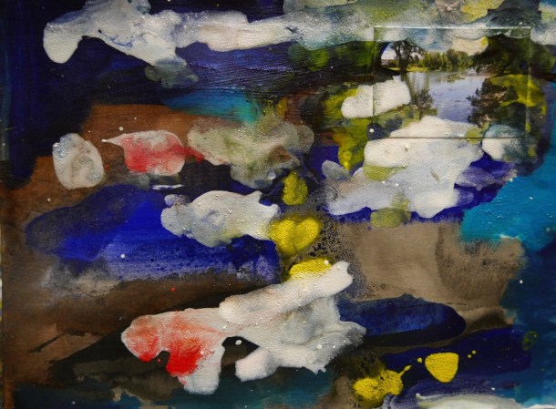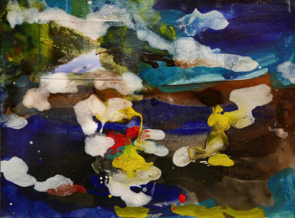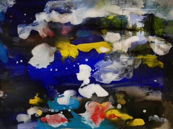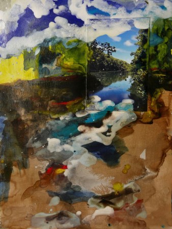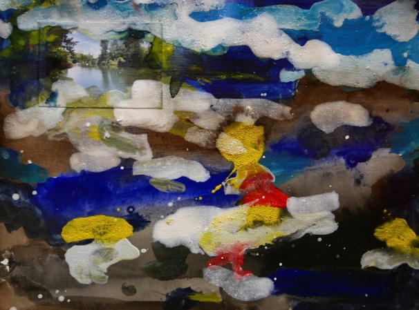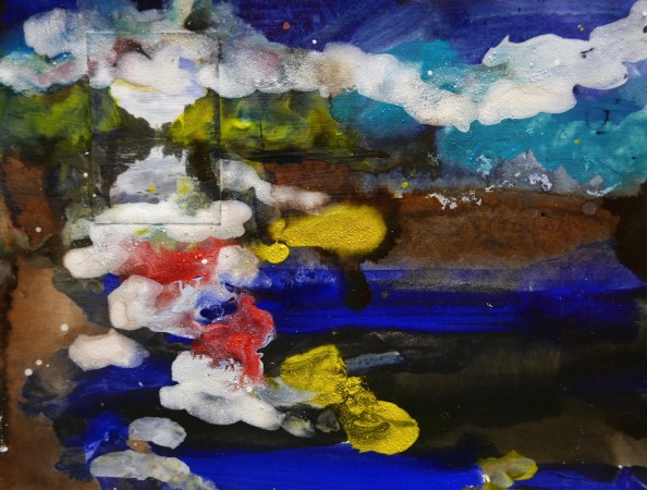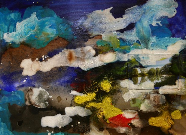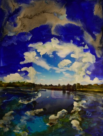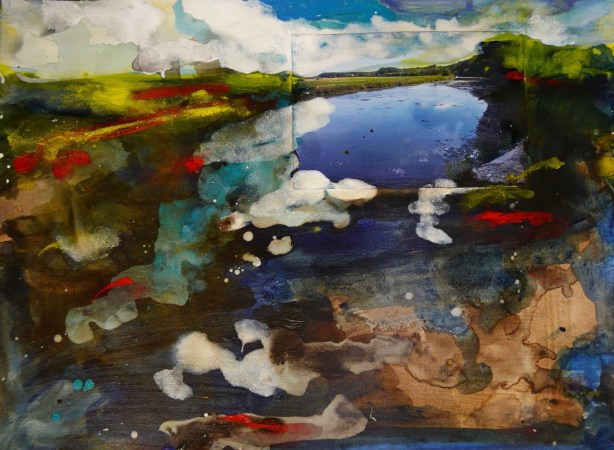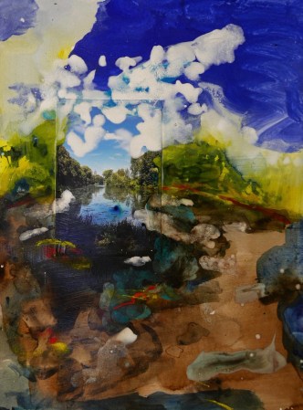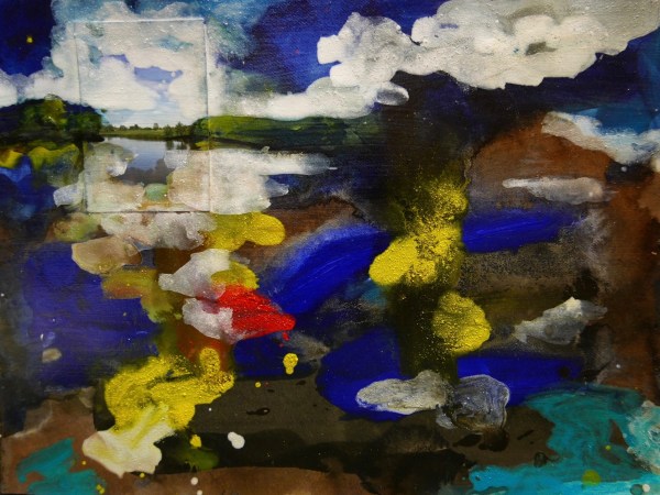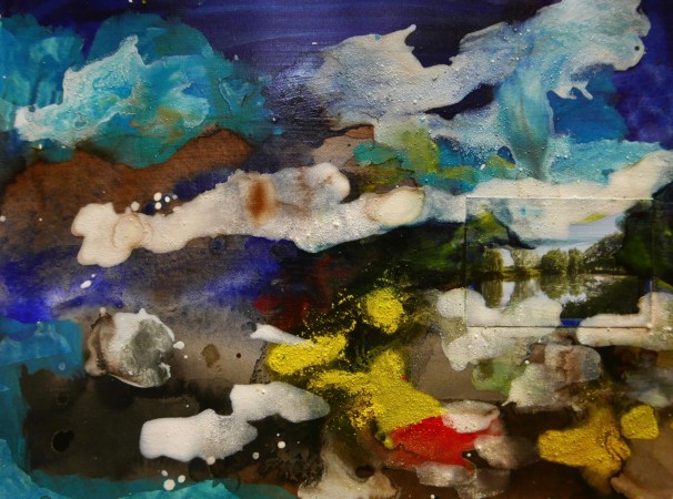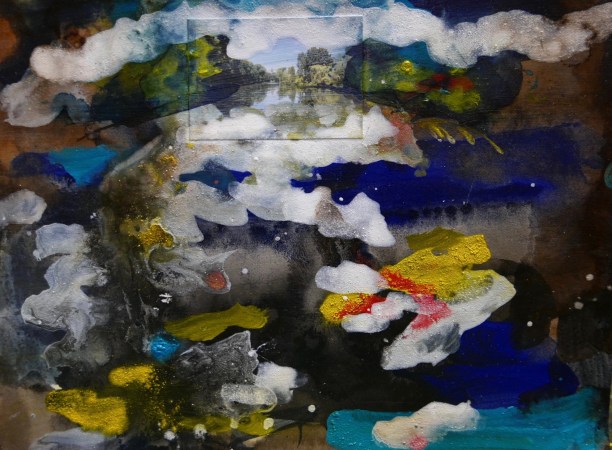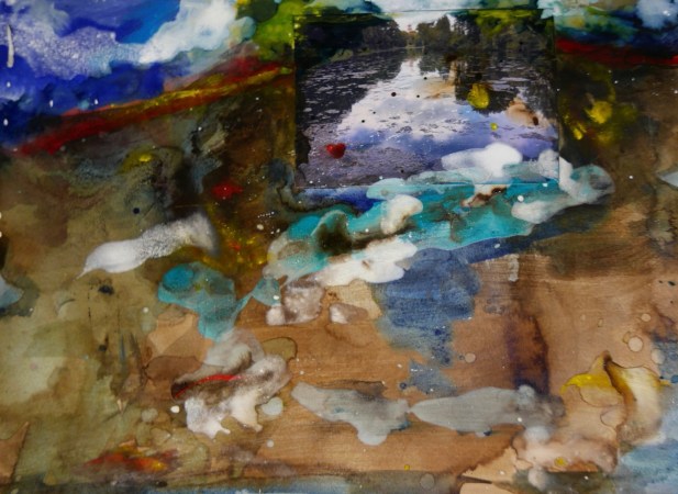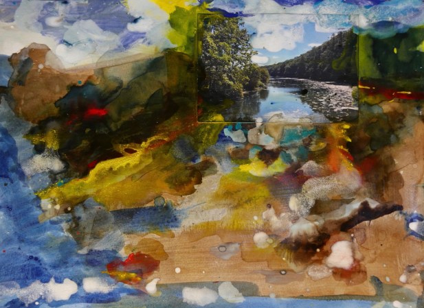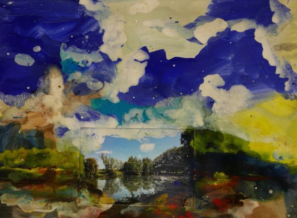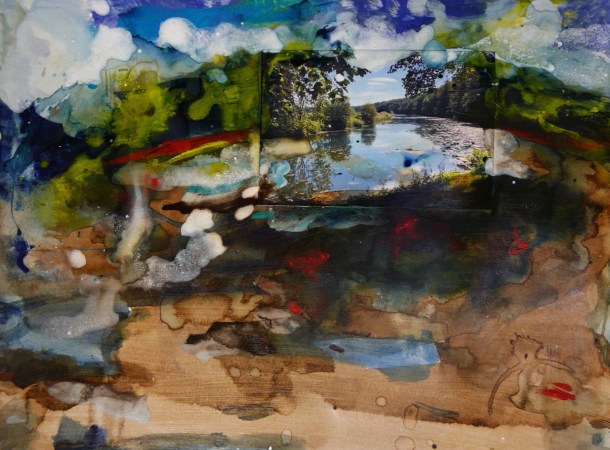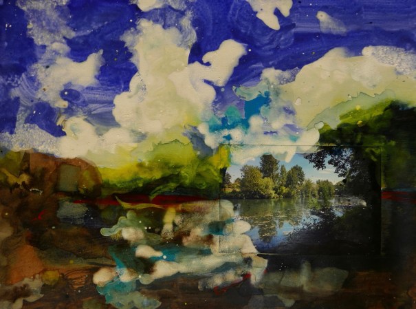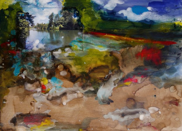 Een ander voorbeeld is het landschap bij Kleve, Kermisdahl, een overblijfsel van een waterloop die nu veranderd is in een soort van kanaal tegen de heuvelrand, die door de ijstijd is opgeworpen in Kleve en omgeving. Ik kom daar al jaren en telkens is de sfeer anders. Deze keer heb ik ervoor gekozen om foto’s te gebruiken in diverse maten zodat er ook verschillende series ontstonden met telkens dezelfde foto’s als uitgangspunt. Zo ontstaan er totaal nieuwe werken die eigenlijk in weinig opzicht op elkaar lijken maar die wel uitgaan van hetzelfde uitgangspunt. Fotografie en schilderkunst bevruchten elkaar en leveren volledig nieuwe producten op waar je heel verschillend naar kunt kijken. Op de grotere werken is de foto goed zichtbaar en trekt alle aandacht. Op de kleinere werken moet je al snel beter kijken – de foto is niet meteen zichtbaar. Maar het principe of uitgangspunt blijft hetzelfde. Ik combineer ook verschillende technieken waardoor er een nieuwe vormentaal ontstaat. De combinatie van pigmenten op waterbasis, gebonden met een acrylaat of met caseïne, inkten en sumi-e (zelfgemaakt of kant en klaar) in verschillende diktes levert telkens nieuwe werken op. Als ik tevreden ben met het eindresultaat krijgt het werk een vernis zodat het beter is beschermd. Nadeel hiervan is echter dat het daardoor langer moet drogen. Maar dat is een kleiner probleem. Mijn werk krijgt daardoor een eigen zeggingskracht, zeker als er meer schilderijen naast elkaar worden getoond. Schilderkunst en fotografie vormen zo een nieuwe wijze van benaderen en verbeelden van het landschap. Telkens weer nieuw, telkens weer anders.