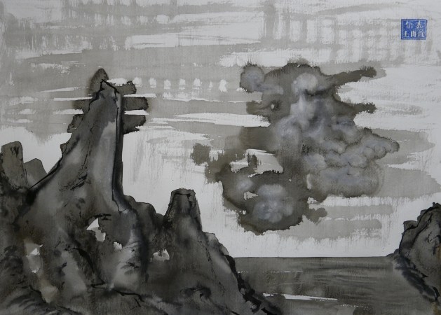 In the act of painting with Sumi total concentration is needed. Not only in the preparations before the painting itself, but also in choosing paper, brushes and the amount of Sumi. You first have to made some Sumi and when you want to paint big parts of a landscape you need more Sumi. When working in a mood and with the same spirit, it is not nice, when Sumi runs out and you have to stop to make new one. I’m attached to mountains and sees. I like to paint the sky, the clouds, fog, the rain and the snow. And all this weather conditions give the landscape an own mysterious face. Not everything is seen, much is suggested. Our brain fills in the missing parts. It came through Japanese painting that mountains and water became main subjects in my work. Bowie writes: “Landscapes are known in art by the term SAN SUI, which means mountain and water. This Chinese term would indicate that the artists of China considered both mountains and water to be essential to landscape subjects, and the tendency in a Japanese artist to introduce both into his painting is ever noticeable. If he cannot find the water elsewhere he takes it from the heavens in the shape of rain. (…) The landscape contains a lofty mountain, rocks, river, road, trees, bridge, man, animal, et cetera. The first requisite in such a composition is that the picture respond to the law of TEN CHI JIN, or heaven, earth and man. This wonderful law of Buddhism is said to pervade the universe and is of widest application to all the art of man. TEN CHI JIN means that whatever is worthy of contemplation must contain a principal subject, its complimentary adjunct,, and auxiliary details. Thus is the work rounded out to its perfection. This law of TEN CHI JIN applies not only to painting but to poetry (its elder sister), to architecture, to garden plans, as well as to flower arrangement; in fact, it is a universal, fundamental law of correct construction. “(p. 52-53)