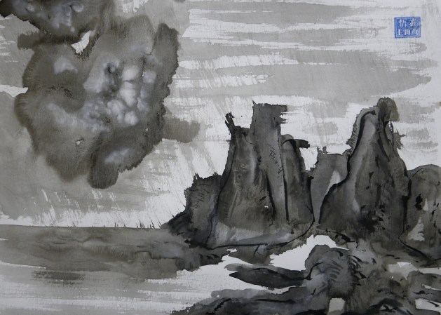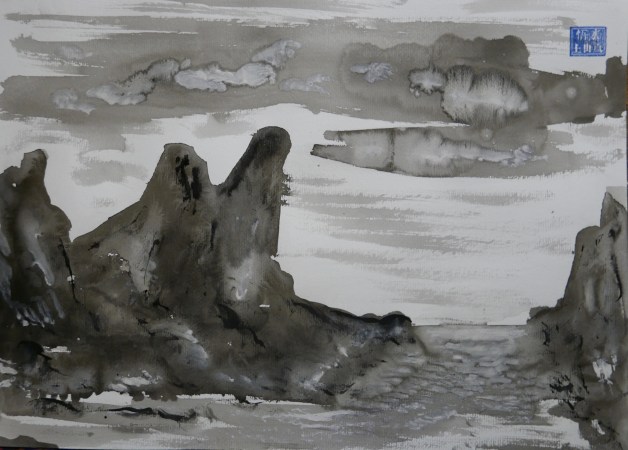 It will stay for me a big challenge to give an answer with my paintings to the questions raised by working with Sumi. Working with Sumi shows not only every mistake, (= that is a wrong use of the brush, so that the spirit of the landscape is hidden, doesn’t come to expression), it shows also the state of mind you’re working in and your spiritual attachment to the subject. It is impossible to make a good painting without this concentration and this state of mind of total awareness of your actions. And last but not least you need the necessary skills to work with Sumi. I’m just a beginner, I discovered the charms of working with Sumi and I use it in different situations. I’m painting landscape with Sumi and landscapes where Sumi is just a little part of it. I didn’t stop to work with other colors. I Use Sumi for the background, the mountains in the distant. But more important for me is also the thinking about landscape painting in Japan, the inspiration in Japanese art and painting. Bowie writes about this the following words: “One of the most important principles in the art of Japanese painting – indeed, a fundamental and entirely distinctive characteristic – is that called living movement, SEI DO, or kokoro mochi, it being, so to say, the transfusion into the work of the felt nature of the thing to be painted by the artist. Whatever the subject to be translated – whether river or tree, rock or mountain, bird of flower, fish or animal – the artist at the moment of painting it must feel its very nature, which, by the magic of his art, he transfers into his work to remain forever, affecting all who see it with the same sensations he experienced when executing it. This is not an imaginary principle but a strictly enforced law of Japanese painting. The student is incessantly admonished to observe it.” (p. 77)