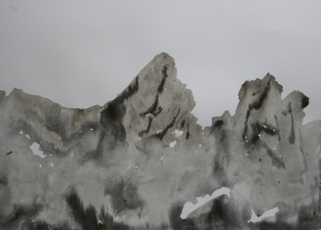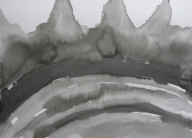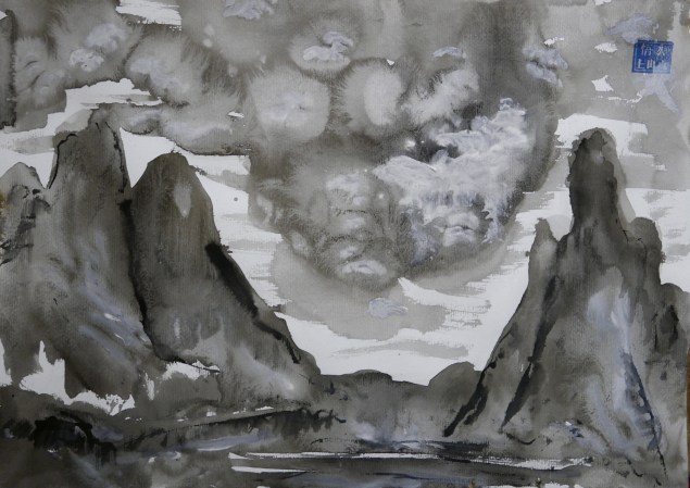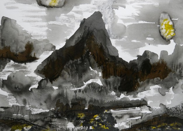 In my work I discovered Sumi again after 25 years. It gives totally new possibilities to express the spirit of a landscape in black, white and grey tones. Painting fog on a mountain became a total new challenge working with Sumi. Painting rain and snow even so. Bowie also writes about this part of the painting: “A canon of Japanese Art which is at the base of one of the peculiar charms of Japanese pictures, not merely in the whole composition but also in minute details that might escape the attention at first glance, requires that there should be in every painting the sentiment of active and passive, light and shade. This is called IN YO and is based upon the principle of contrast for heightening effects. The term IN YO originated in the earliest doctrines of Chinese philosophy and has always existed in the art language of the Orient. It signifies darkness (IN) and light (YO), negative and positive, female and male, passive and active, lower and upper, even and odd. (…) The law of form, in art called KEISHO or KAKKO, is widely applied for determining not only the correct shape of things but also their suitable or proper presentation according to circumstances. (…) It regulates the shape that objects should take according to conditions surrounding them, whether seen near or far off, in mist or in rain or in snow, in motion of in repose.” (p. 49-50)